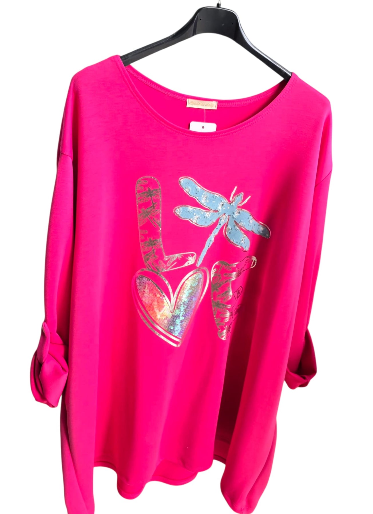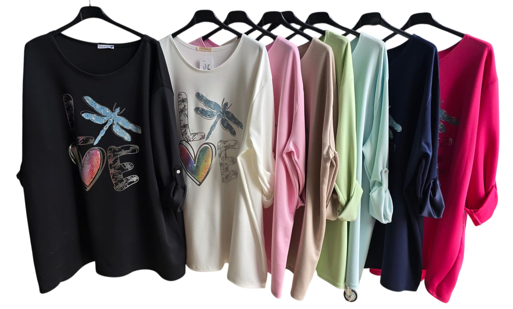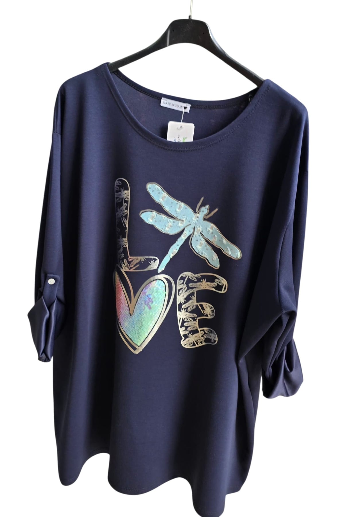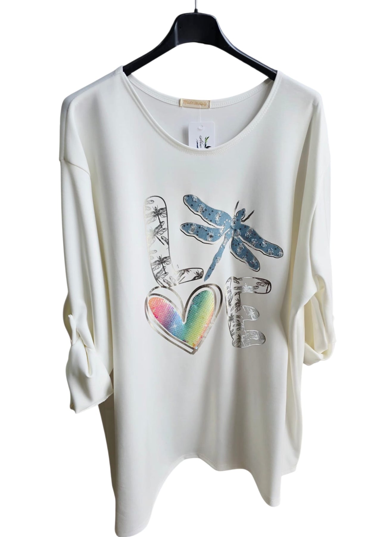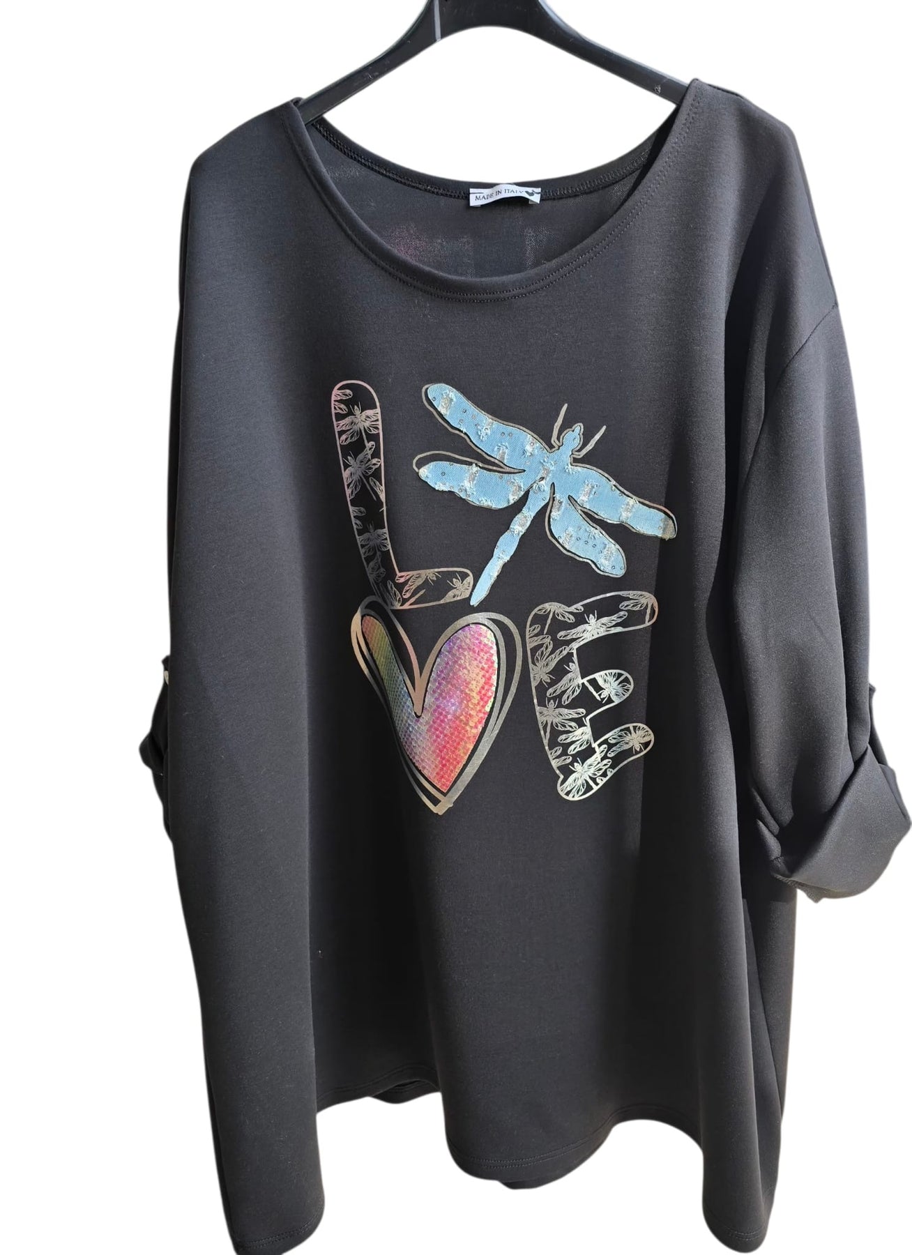 A stylish and easy-wear jersey top featuring a standout metallic LOVE print with dragonfly and heart detailing for a touch of sparkle. Designed with a relaxed fit and flattering scoop neckline, this top offers comfort while making a statement.