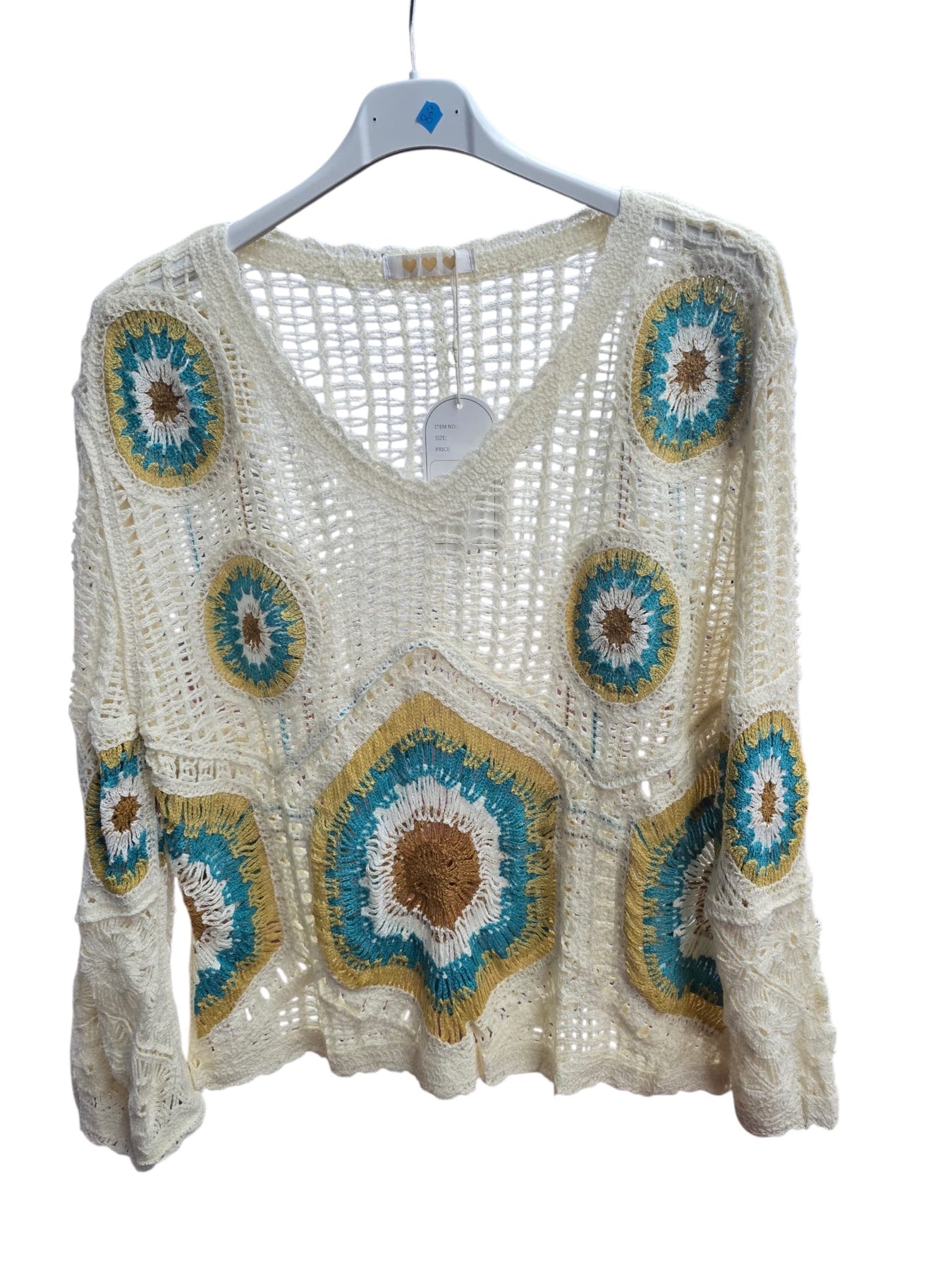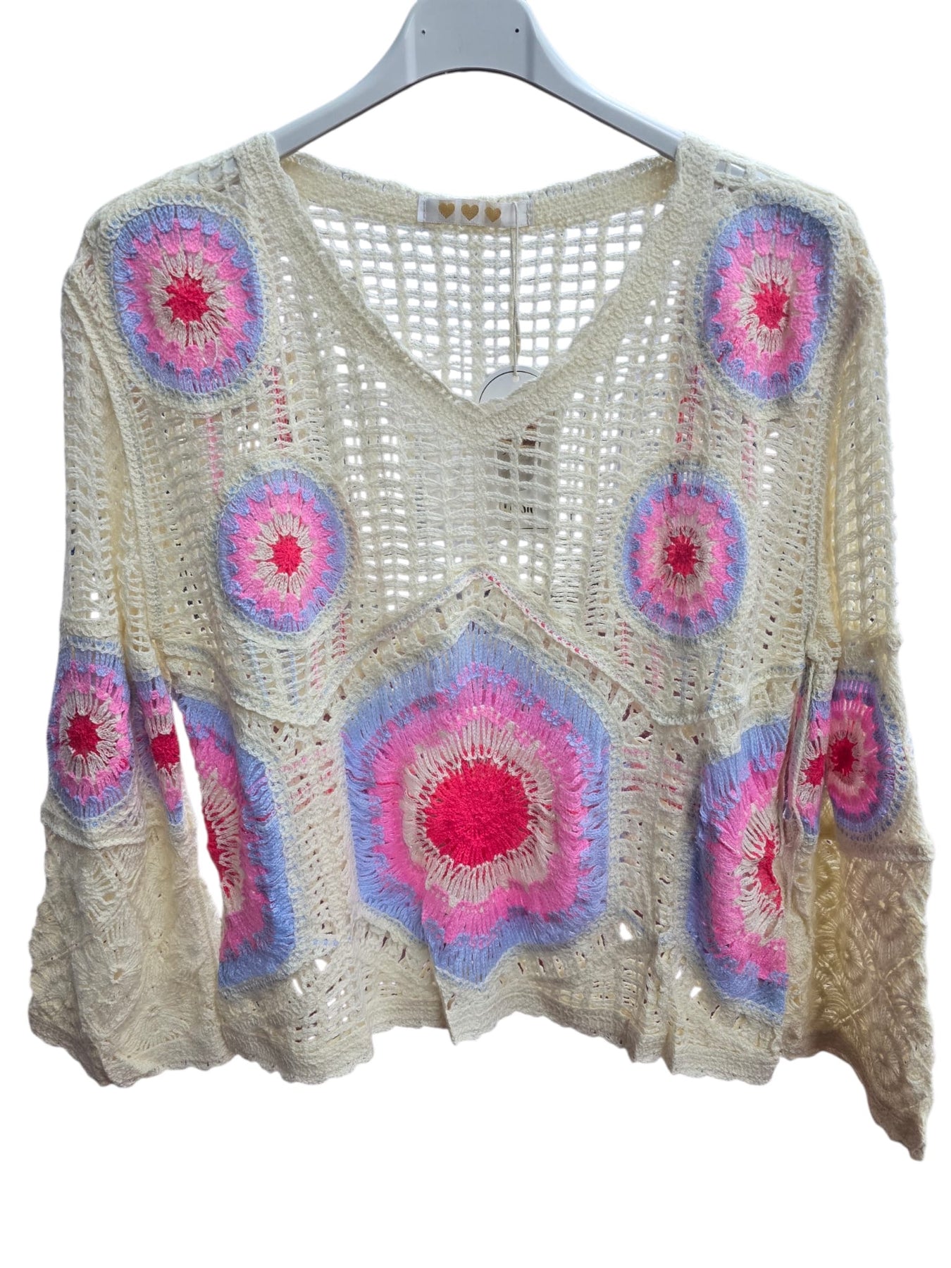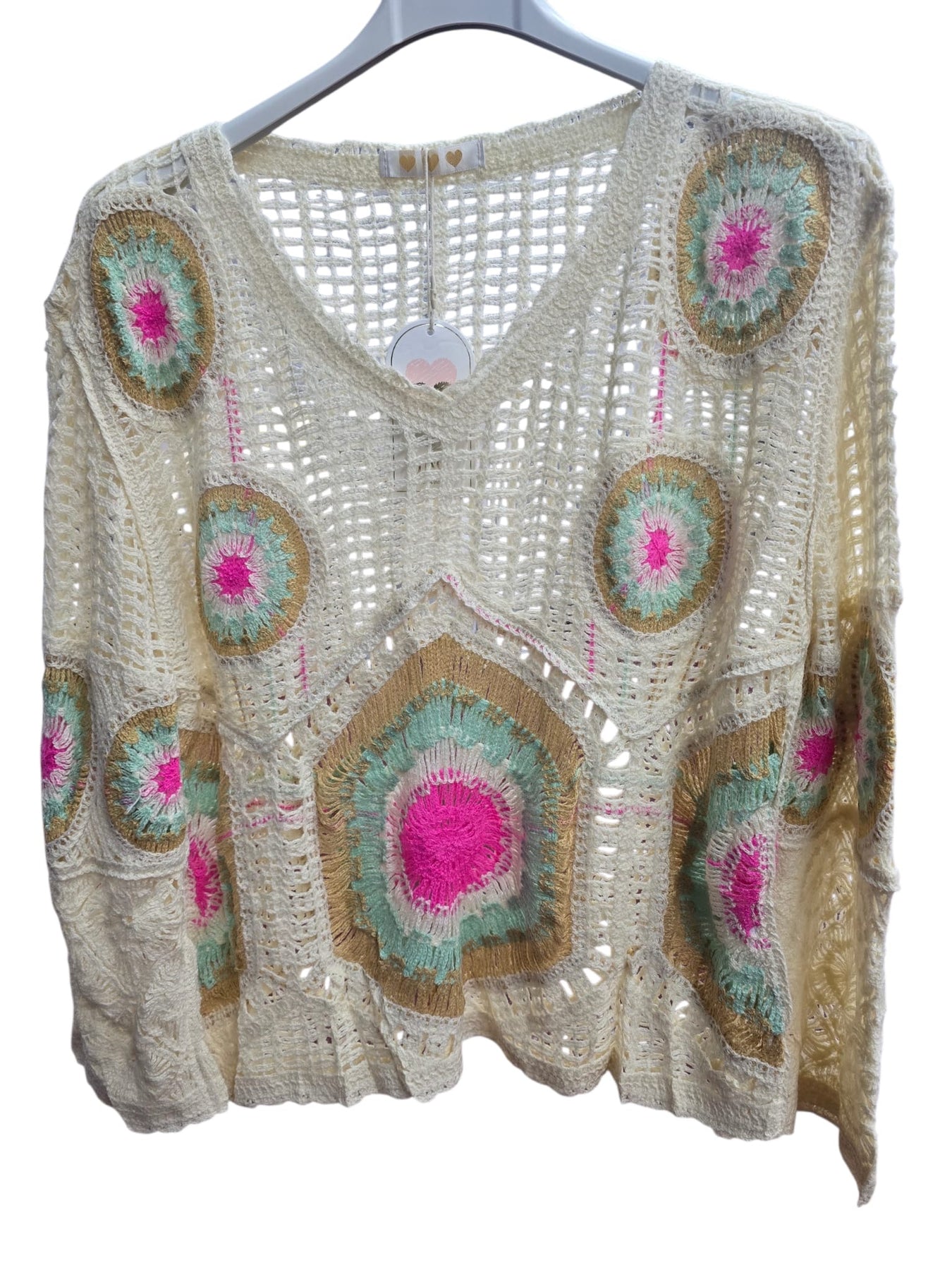 A beautifully crafted crochet knit top featuring delicate pastel circular motifs on a soft open-knit base. Designed with a flattering V-neckline and relaxed long sleeves, this lightweight piece offers an effortless bohemian look. Perfect for layering over camisoles or bralettes, making it an ideal addition to boutique spring and summer collections.