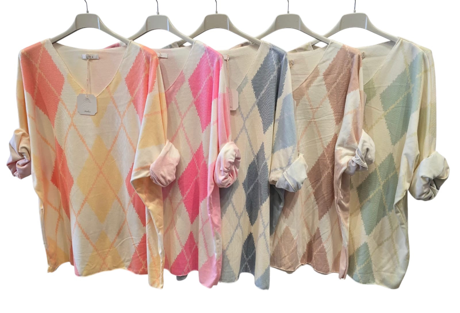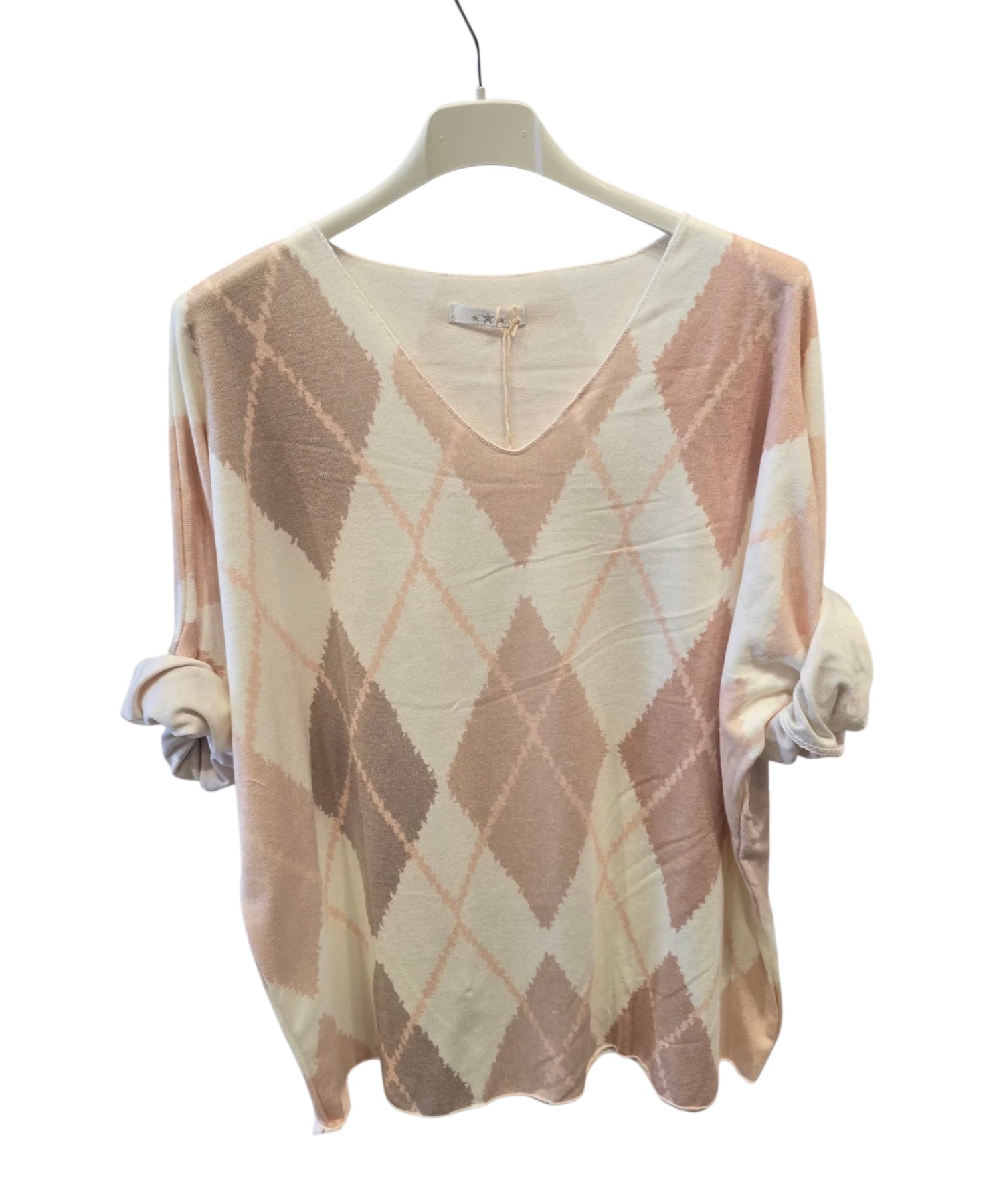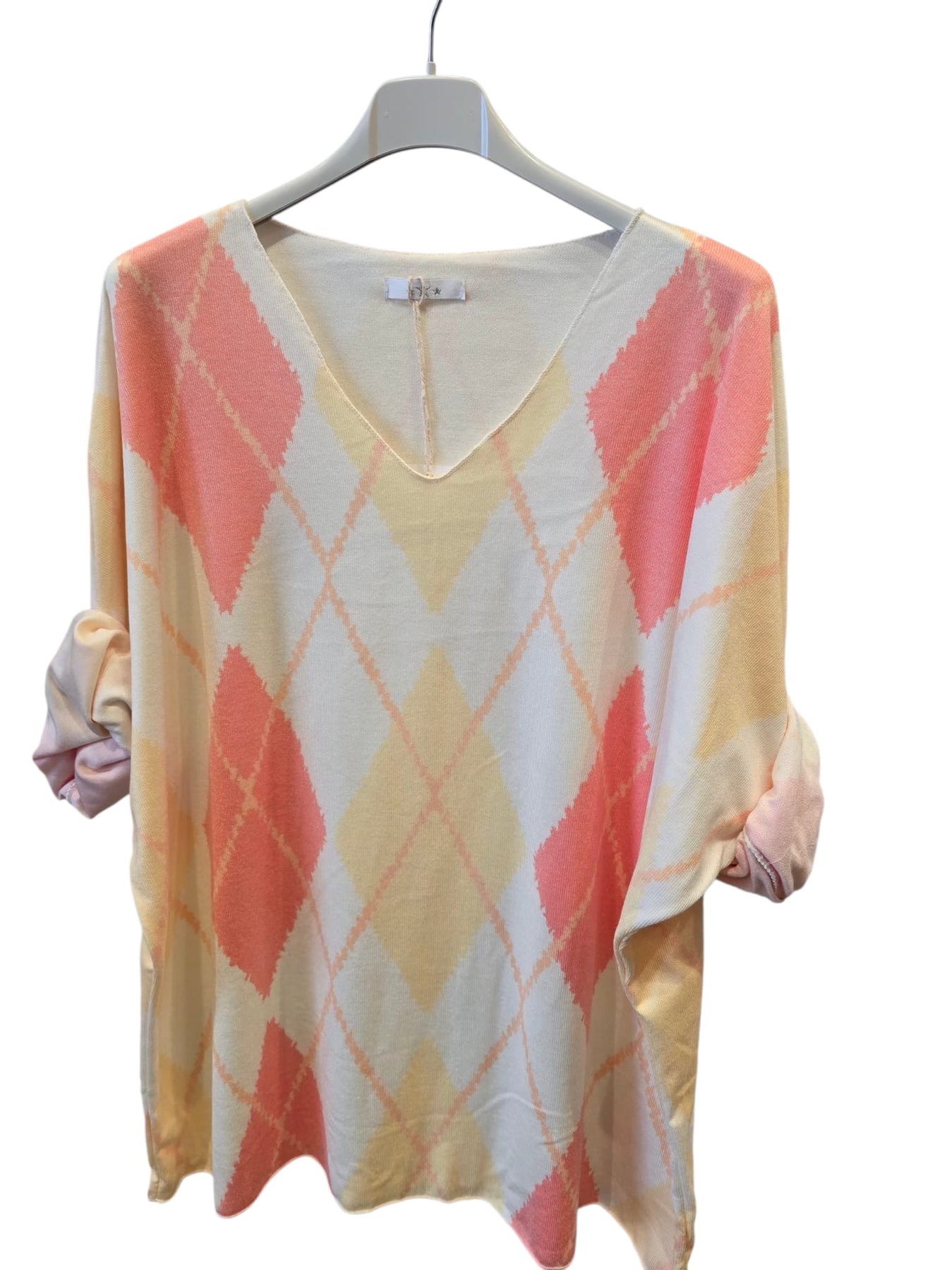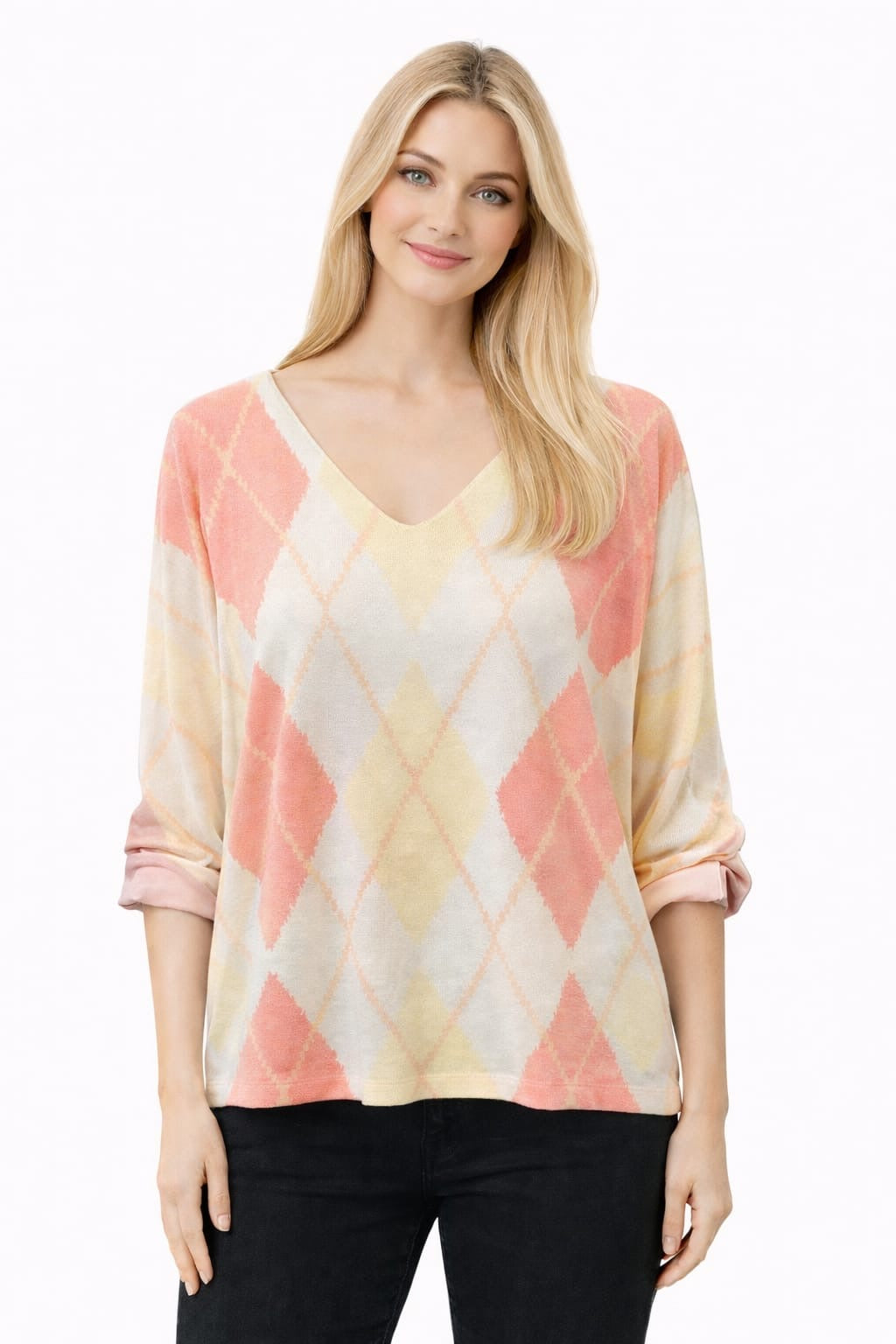 A lightweight argyle knit top designed with a relaxed silhouette and flattering V neckline.